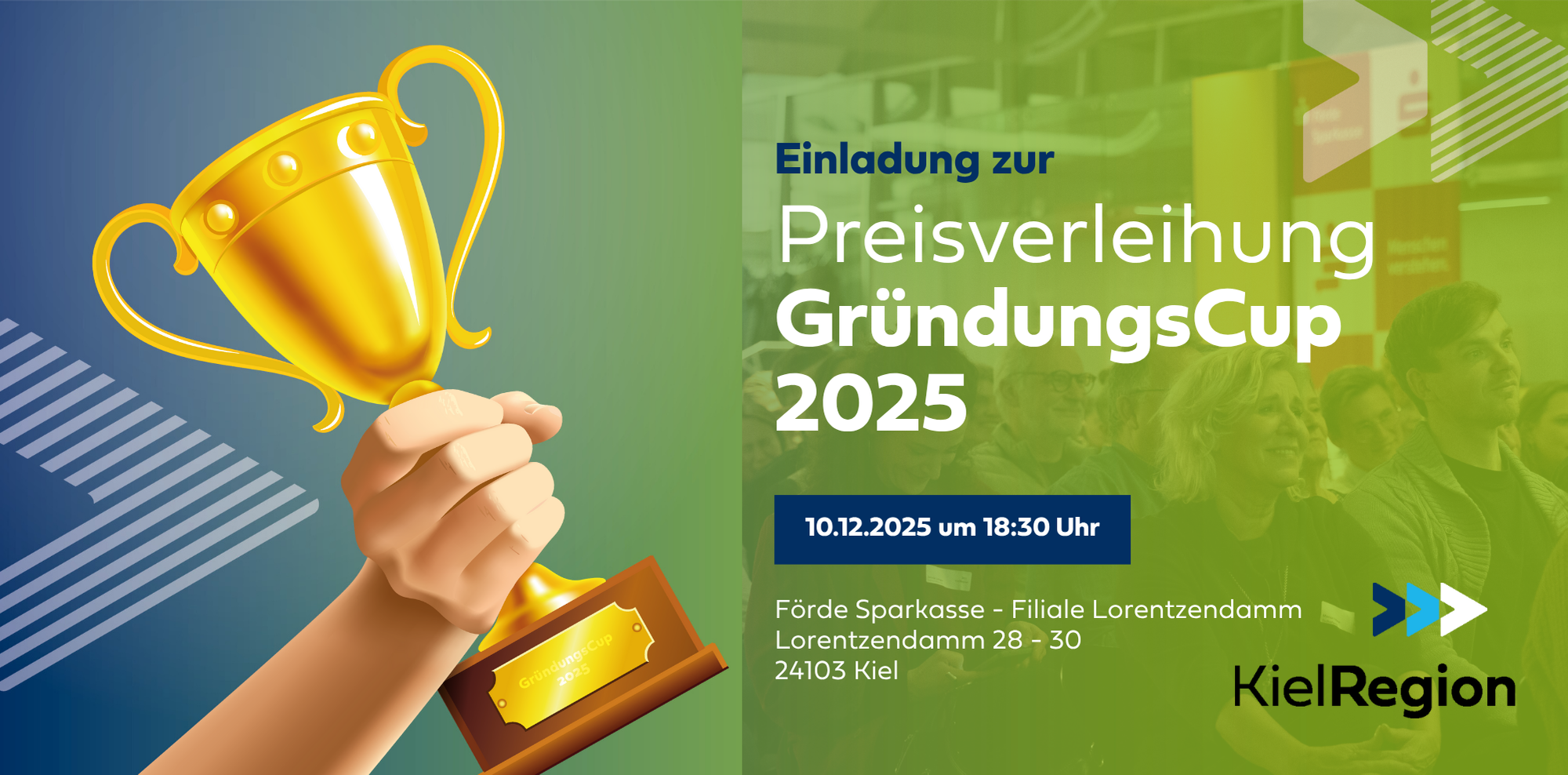 Am Mittwoch, den 10. Dezember 2025, um 18:30 Uhr (Ankommen ab 17:45 Uhr) laden wir Sie herzlich ein zur feierlichen Preisverleihung des GründungsCup 2025 in der Förde Sparkasse (Lorentzendamm 28-30, 24103 Kiel)!
