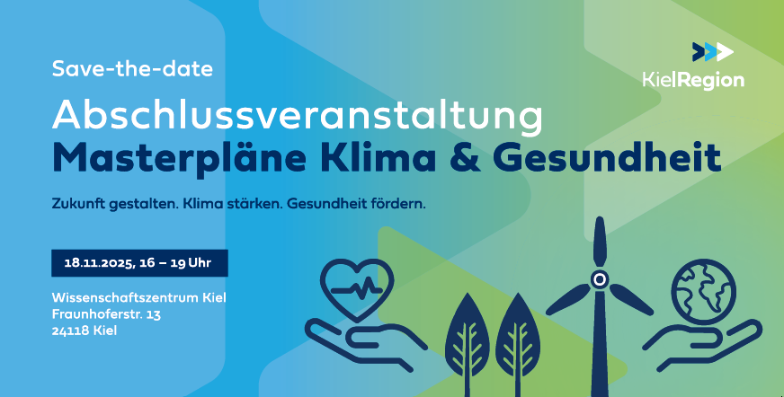 Gemeinsam machen wir die KielRegion resilient gegen die Klimakrise und gestalten sie als gesunde, lebenswerte Region für die Zukunft. Auf Basis des Strategieprozesses KielRegion 2030 haben wir zwei Masterpläne entwickelt, die konkrete Maßnahmen für die Themen Klimaschutz & -anpassung sowie Gesundheitsförderung aufzeigen. Wir laden Sie herzlich zum feierlichen Projektabschluss ein – mit spannenden Einblicken in die Ergebnisse und einem gemeinsamen Blick in die Zukunft unserer KlimaRegion und GesundheitsRegion – Aus Wir wird mehr! Ort: Wissenschaftszentrum Kiel Zeit: 18. November, 16:00–19:00 Uhr Weitere Infos & Anmeldung HIER. |