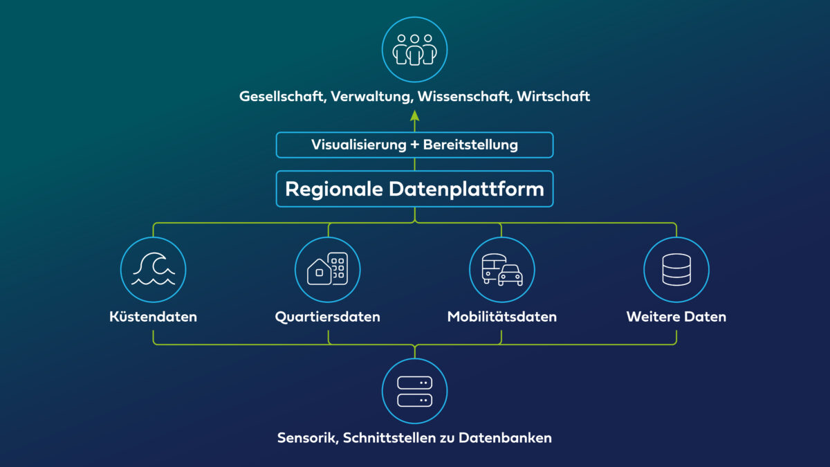 Bisher sind viele relevante Daten in verschiedenen Systemen, Formaten und Verwaltungsstrukturen verteilt. Das erschwert oder verhindert die effiziente Nutzung und datengetriebene Entscheidungsfindung. Die Regionale Datenplattform wird die Daten, insbesondere solche aus den Handlungsfeldern Mobilität, Quartiersentwicklung und Küstenmanagement, zusammenführen, standardisieren und sicher verfügbar machen. Damit schaffen wir eine Basis für zahlreiche smarte Lösungen – von Umweltmonitoring über Verkehrsoptimierung bis hin zu Beteiligungsverfahren.